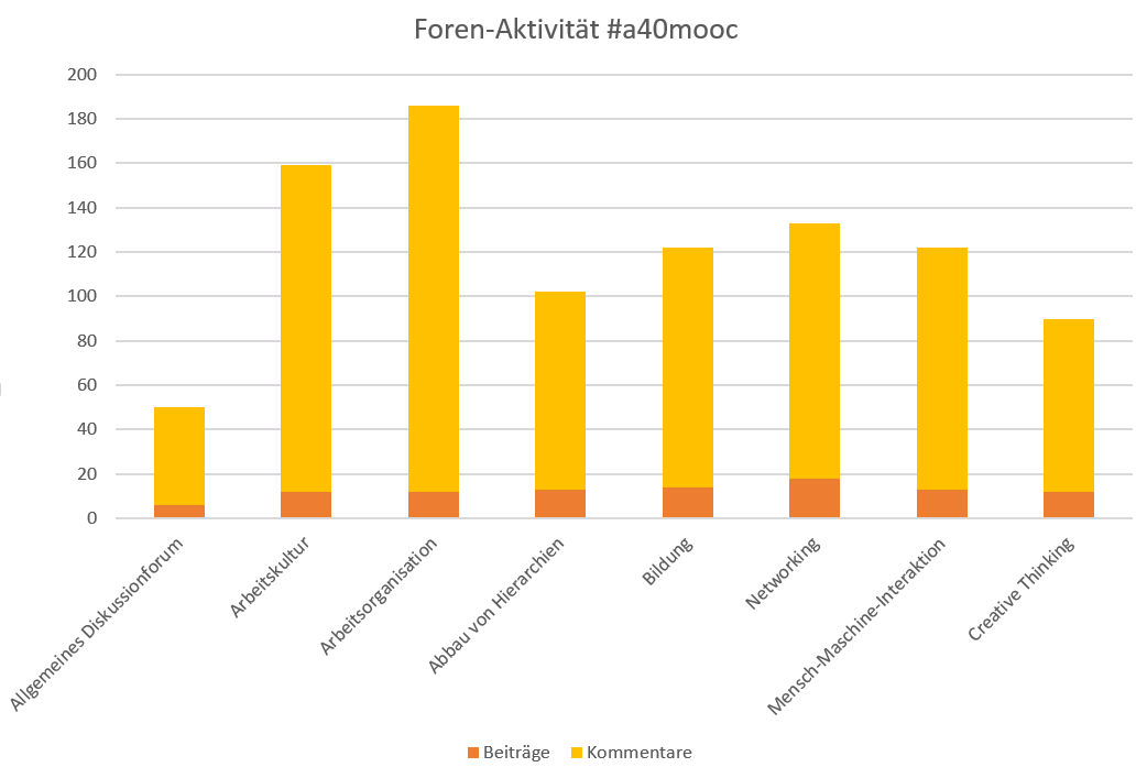 Für jeden Tag gab es Früh, Mittag und Nachmittag ein Video sowie meist zusätzlich Langfassungen von Interviews mit Einzelpersonen. Da sich die Laufzeit der ersten drei Videos meist schon auf eine knappe halbe Stunde summierte, bin ich meist zu den ausführlichen Interviews nicht gekommen. Ich habe versucht, zumindest Früh- und Mittagsvideo anzusehen. Von den Nachmittagsvideos habe ich fünf von sieben geschafft. Darüber hinaus gab es nämlich zusätzlich die Diskussion in den mooin-Foren, Dialog auf Twitter (Hashtag #a40mooc) sowie Austausch in einer offenen, selbstorganisierten Lerngruppe auf Slack. Hier als Beispiel die Auswertung der Beiträge und Kommentare in den Foren (Stand: 19.4., 18:10 Uhr):