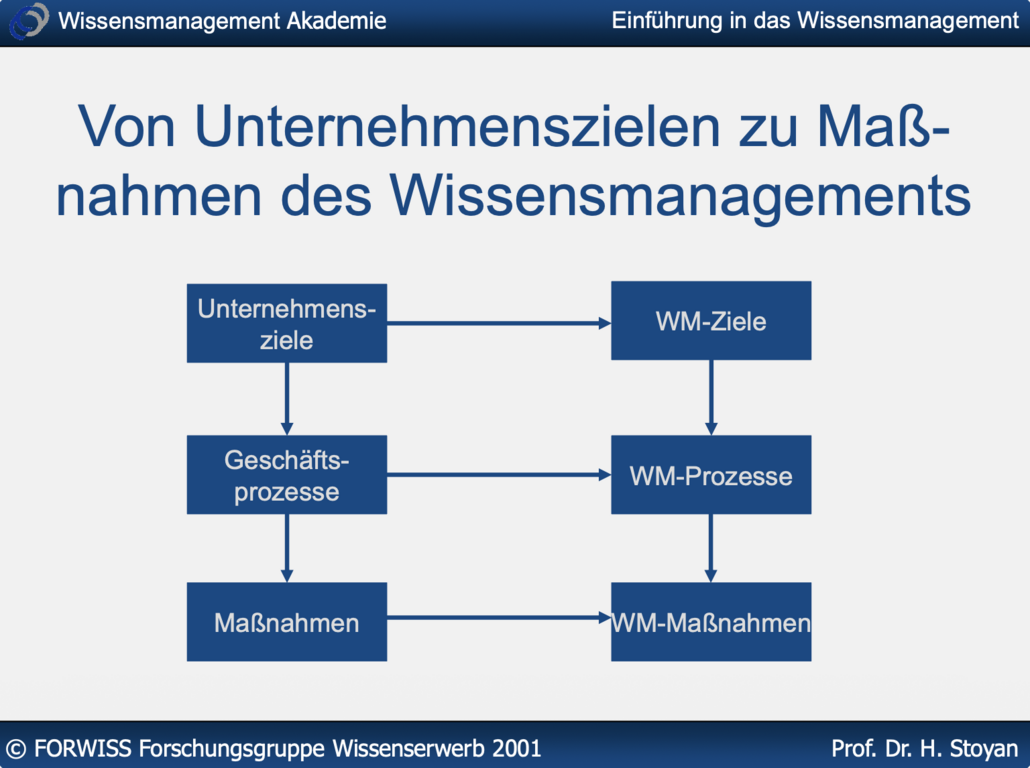In unserem Erlanger Modell des Wissensmanagements – das in seiner ersten Version noch aus der Zeit vor der Gründung 2001 stammt – ist bereits die enge Kopplung von Wissenszielen mit Unternehmenszielen enthalten. In der Praxis ist es aber immer wieder schwierig, diese Ableitung vorzunehmen, weil Wissensmanagement-Ansätze nicht von Führung oder Strategieabteilungen, sondern z.B. von HR oder IT getrieben werden, die Einzelthemen nicht bevorteilen wollen.