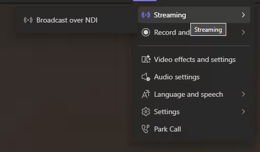 Mit der Technologie NDI (Network Device Interface) bekommt man das Beste aus beiden Welten: NDI ist in Microsoft Teams bereits integriert. Es stellt alle Audio- und Videoströme der Videokonferen als einzelne Quellen per NDI zur Verfügung. So kann man z.B. Redner:in und gezeigte Folien vor einem Hintergrund im Veranstaltungsdesign aufzeichnen. Alle anderen Teilnehmenden sind in der Aufzeichnung nicht zu sehen oder zu hören. Streaming per NDI wird in Teams unter … > Streaming > Broadcast over NDI aktiviert (muss in der Organisation erlaubt sein). Für die Aufzeichnung eignent sich das kostenfreie Tool OBS Studio (Open Broadcaster Studio).