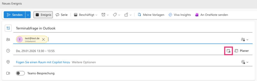Was viele nicht wissen: Microsoft Outlook hat mittlerweile eine eingebaute Funktion Terminplanungsumfrage (Anleitung). Diese ist zugegebenermaßen etwas versteckt: man muss einen neuen Termin anlegen, die Teilnehmer:innen hinzufügen (im Screenshot test@test.de) und dann erscheint neben dem Datum ein Button, über den man eine Terminumfrage erstellen kann. Die Teilnehmer:innen erhalten ein Link zu einem Formular und können ihre Favoriten auswählen.