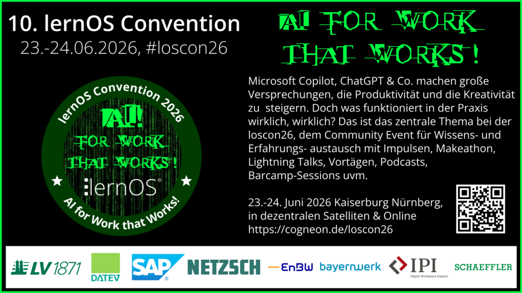 Die lernOS Convention hat das Motto „AI for Work that Works!“. Wir wollen entlang von Rollen und Funktionen gemeinsam herausfinden, welche „Heilsversprechen“ der Chatbot-Anbieter stimmen und welche Ansätze in der Praxis wirklich, wirklich funktionieren. Dafür ist jetzt schon das AI Crowdsourcing 2026 gestartet, bei dem wir Beispiele guter Praxis sammeln – macht zahlreich mit! Weitere Infos zu Thema, Format und die Anmeldung findet ihr unter cogneon.de/loscon26. Den Frühbucherpreis gibt es bis 31. März.