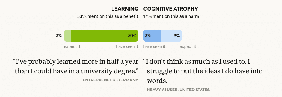 - Lernen ist ein starker, erlebter Nutzen (33%): Ein Drittel aller Befragten nennt Lernen als konkreten Gewinn – nicht als Erwartung, sondern als gelebte Erfahrung. Gleichzeitig sorgen sich 17% um kognitive Verarmung durch KI-Abhängigkeit. Auffällig: Lehrkräfte berichten 2,5- bis 3-mal häufiger als der Durchschnitt, kognitive Rückgänge bei Lernenden beobachtet zu haben.