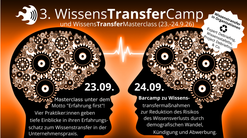 Das 3. WissensTransferCamp (#wtc26, 24.09.) ist die zentrale Veranstaltung für die Themen Wissenstransfer & Wissensbewahrung in Organisationen im deutschsprachigen Raum. Sie ist aus dem Expert Debriefing Moderator:innen Meetup hervorgegangen, das über die Pandemie „eingeschlafen“ ist. Mit der vorgelagerten WissensTransferMasterclass (23.09.), in der vier langjährige Expert:innen tiefe Einblicke in ihre Praxis geben, bieten die zwei Tage geballtes Wissen aus der Praxis. Beide Veranstaltungen können unabhängig voneinander gebucht werden, die Masterclass ist in Präsenz, beim Barcamp ist hybride Teilnahme per Microsoft Teams möglich.